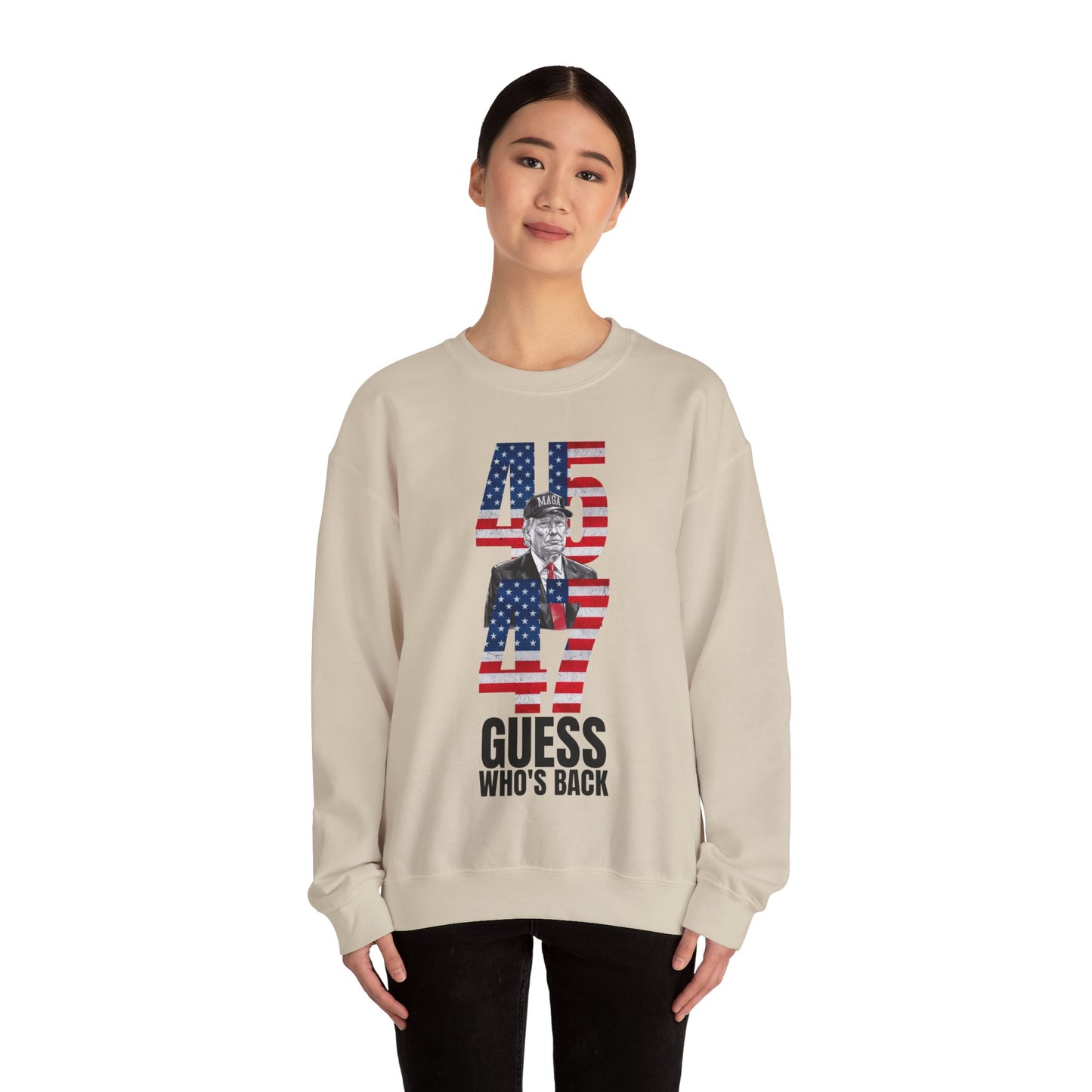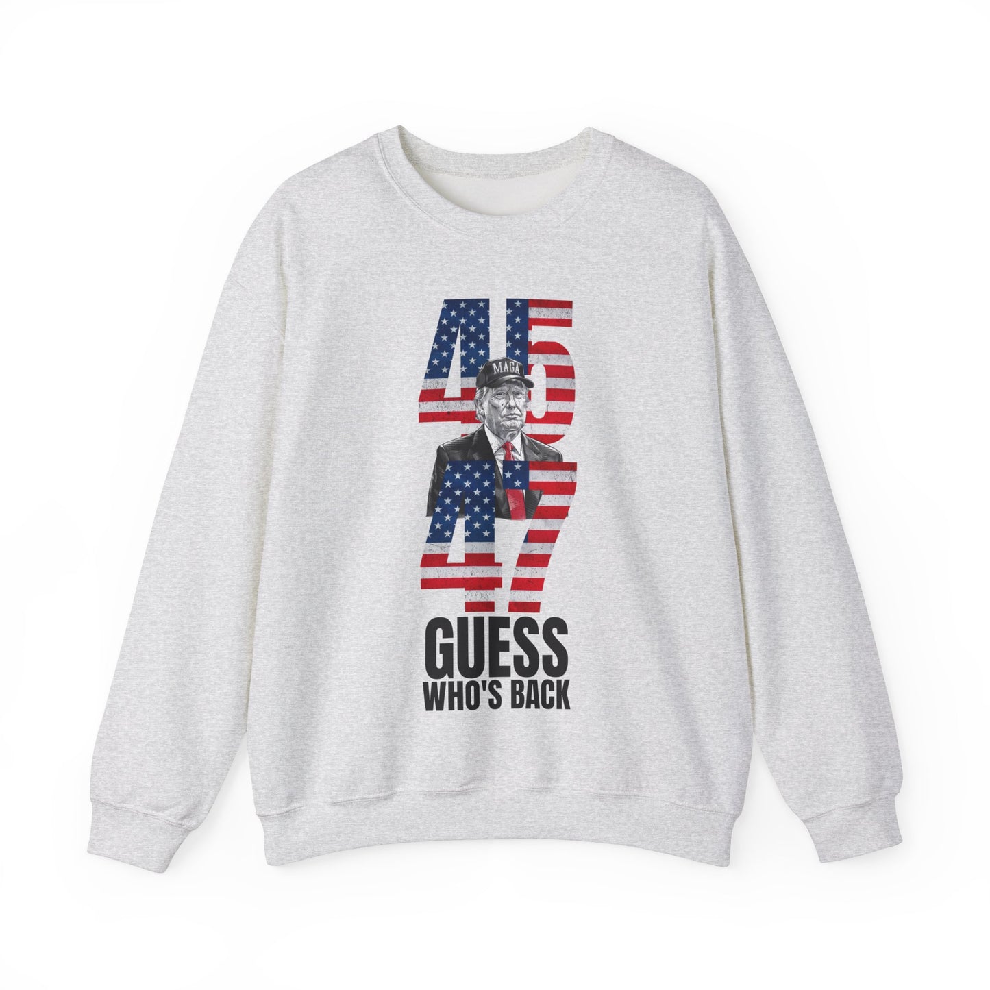 Get ready to make a bold statement with the "Guess Who's Back, 45 & 47 Trump Sweatshirt"! This unisex heavy blend crewneck combines comfort and a touch of humor, making it the perfect addition to your wardrobe for any occasion.