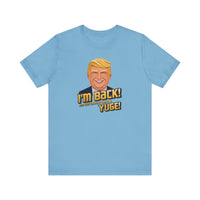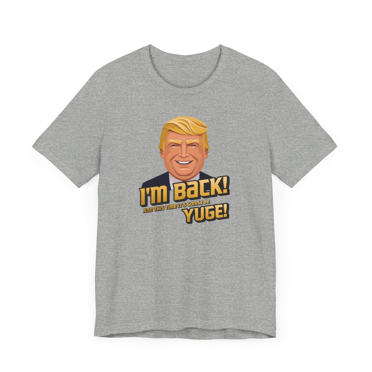 Get ready to express your enthusiasm with the "I'm Back and This Time It's Gonna Be Yuge" Trump T-Shirt! This classic unisex jersey short sleeve tee combines comfort and style, making it an ideal choice for rallies, casual outings, or just lounging at home. With its bold statement and eye-catching design, this shirt is sure to turn heads and spark conversations.